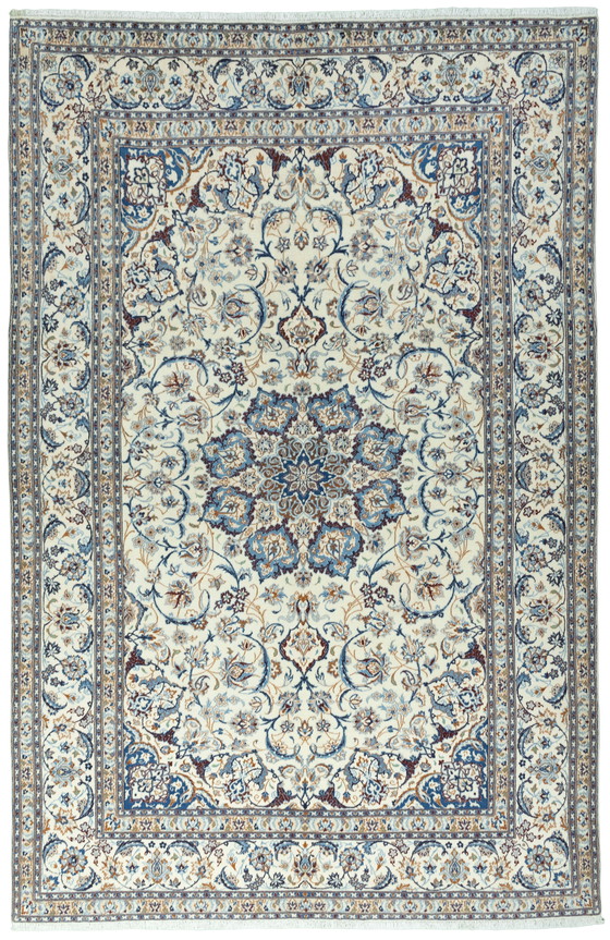 Dit elegante Nain 9La tapijt maakt indruk met zijn harmonieuze kleurenschema in ivoor, blauw en delicate bruintinten. Het sierlijke medaillon in het midden is fijn bewerkt en wordt omringd door gebogen rankenmotieven - een echte klassieker onder de hoogwaardige oosterse tapijten.