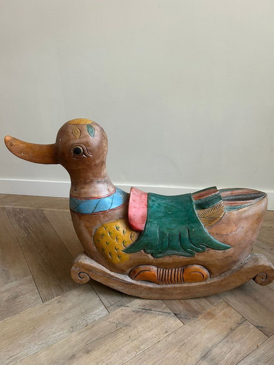 Vintage houten schommel eend, handgemaakt, decoratief en uniek. Mooi als verzamelobject of als decoratie voor in huis.