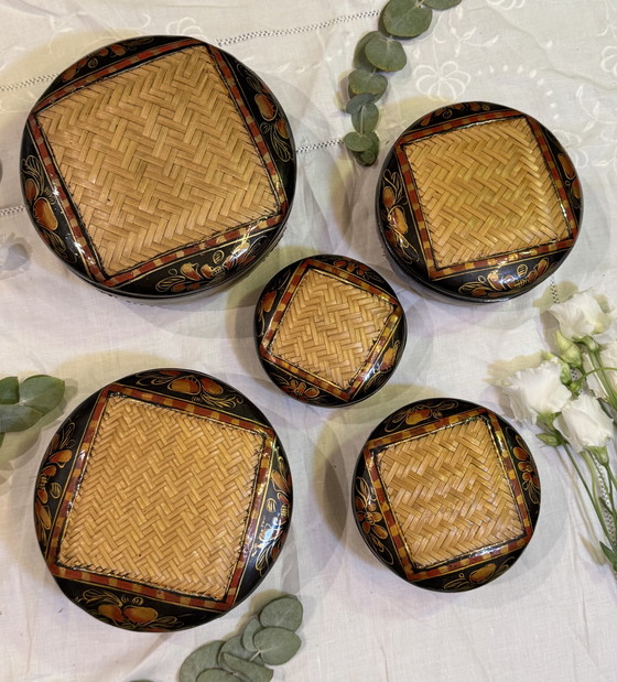 ✨ Set van 5 stapelbare doosjes in stro-marqueterie ✨