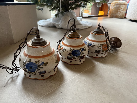 Verlicht uw ruimte met een vleugje vintage charme met deze prachtige, handgeschilderde hanglampen uit de jaren 80. Elke lamp is versierd met gedetailleerde bloemmotieven, in een levendig kleurenpalet van blauw en oranje tegen een klassieke witte keramische achtergrond.