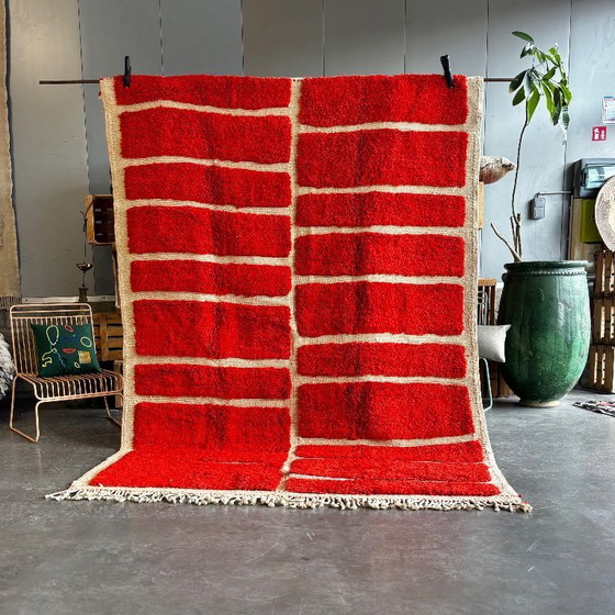 Breng warmte en artisticiteit in huis met dit prachtige Marokkaanse Mrirt-wollen vloerkleed, handgeweven door bekwame ambachtslieden in het Atlasgebergte. Met een opvallend rood en crèmekleurig geometrisch patroon combineert dit vloerkleed de tijdloze schoonheid van traditioneel Berbers vakmanschap met een moderne, minimalistische touch.