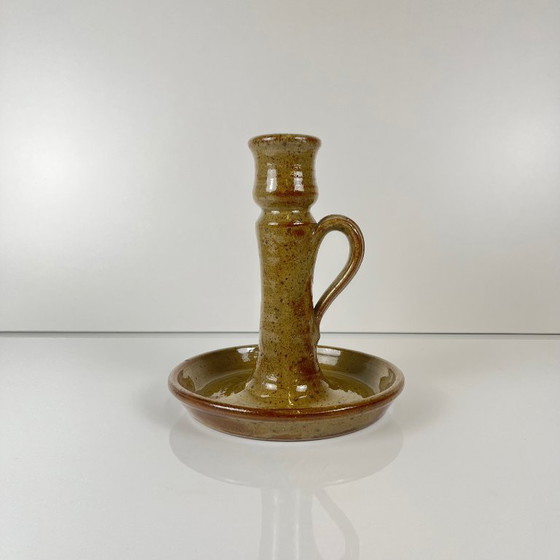Handkandelaar van steengoed Afmetingen: Diameter: 15 cm Hoogte: 17 cm Goede staat, vintage exemplaar, vertoont ouderdomssporen, zie foto's