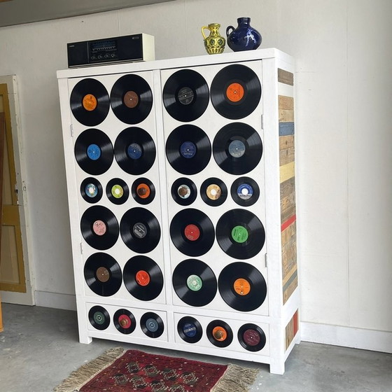 Unieke design demontabele handgemaakte eigen ontwerp vinylkast ! De kast is bedacht en gemaakt in onze meubelmakerij. Meestal maken we in opdracht onze meubels, maar hoe leuk is het om af en toe `vrij` te werken ! ZIe voor ons portfolie onze andere website www.sloophoutwerk.nl De kast heeft een wit frame, de zijkanten zijn gemaakt van sloophout. De deuren zijn gemaakt van underlayment, welke nadat ze goed glad geschuurd en wit gemaakt zijn, beplakt zijn met vintage vinyl, zowel LP`s als singles. Onder de deuren zitten 2 royale lades die eveneens beplakt zijn met singles. Achter de deuren bevinden zich 2 legplanken over de gehele breedte. De deuren sluiten d.m.v. magneetslotjes. De vintage zilverkleurige grepen zijn helemaal passend in de jaren 70 vibe. Uiteraard sluiten de deuren en lopen de lades soepel. Er is dus gebruik gemaakt van gebruikte materialen, alleen het frame zelf is van nieuw hout gemaakt (B keus). Een ware blikvanger deze kast, waar er maar één van bestaat ! Te gek voor een liefhebber van vinyl om platen & apparatuur in op te bergen, maar ook als `gewone` opberger een fijne kast. Wat te denken als kinderkamer kledingkast! Tegen een meerprijs van 35 euro kan er een roede in gemaakt worden t.b.v. kleding. Maten: B143 x D50 x H184,5 cm. De kast is demontabel wel zo handig voor vervoer en/of trapgat !