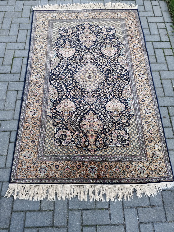 Dit prachtige handgemaakte vintage tapijt biedt een tijdloze elegantie die elke ruimte zal verrijken. Met zijn rijke kleurenpalet van diepblauw, beige, bruin en subtiele roze accenten, vormt het een visueel middelpunt dat zowel verfijning als warmte uitstraalt.