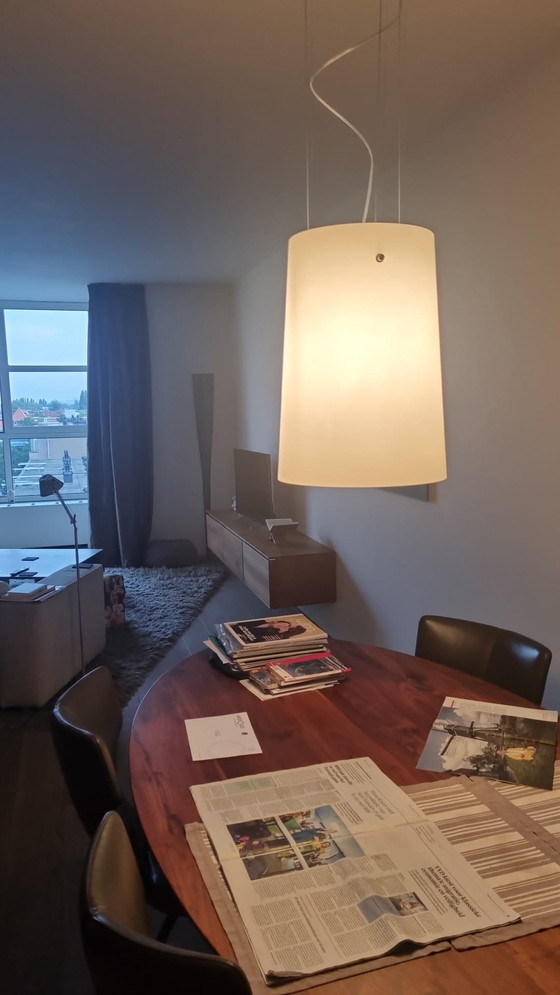 Hanglamp Prandina Sera 3, melkglas. Van beneden naar boven taps toelopende cilindervorm. Afmetingen van de lamp: 50cm hoog, 32 cm onderste doorsnede. Warm, prachtig licht, dimbaar en met lichtbron. Nu afgesteld op 140cm van rozet tot onderzijde lamp, maar corrigeerbaar. In onbeschadigde staat.