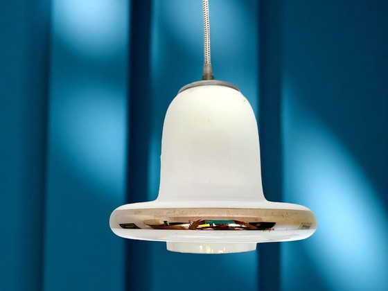 De kap is gemaakt van wit opaalglas met een zilveren streep; de elektriciteitskabel is nieuw, we hebben een met zwart en wit textiel beklede kabel gebruikt.