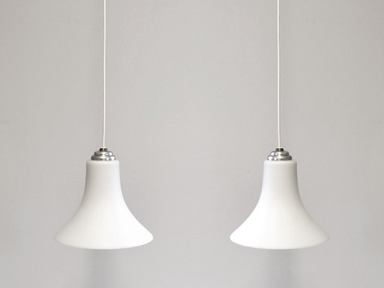 Aangeboden dit schaarse set van 2 trompetvormige glazen hanglampen.