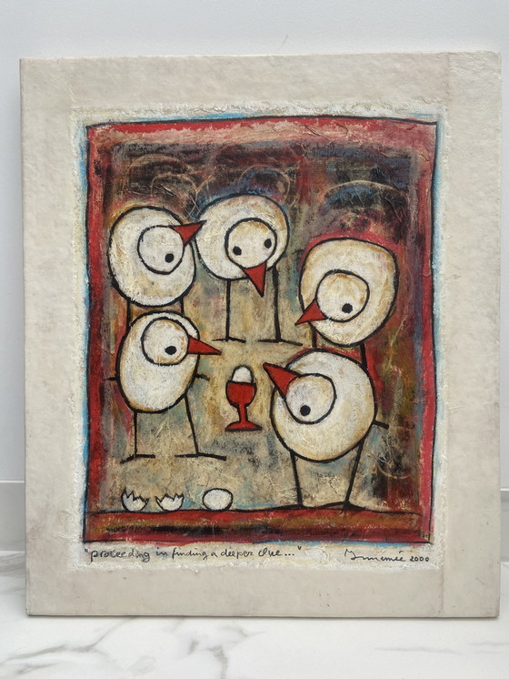 Dompel jezelf onder in de fantasierijke wereld van Hans Innemee met "Proceeding in Finding the Deeper Clue", een fascinerend schilderij op een robuust houten paneel. Dit kunstwerk toont een charmante verzameling gestileerde vogels die een centrale figuur omringen, elk element weergegeven met Innemee's kenmerkende krachtige lijnen en boeiende compositie. De levendige rode en zachte witte tinten contrasteren prachtig met een gestructureerde achtergrond, waardoor een opvallend visueel verhaal ontstaat dat uitnodigt tot nieuwsgierigheid en reflectie. Bekend om zijn vermogen om gesprekken en verbeelding aan te wakkeren, is dit werk een perfecte aanvulling op elke kunstcollectie, klaar om te inspireren en te boeien.