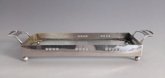 35x10x5 cm, verzilverd koper, met kristallen glazen inzetstuk, gemerkt. In goede staat, met lichte gebruikssporen - voor dit soort objecten wordt dit beschouwd als uitstekende staat. Zeldzaam. Ofner was begin 1900 artistiek leider van het bedrijf, samen met Josef Margold. Verzending binnen de EU: € 35