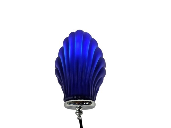 Deze prachtige schelplamp van Happy Light, vervaardigd in de jaren '90 in Nederland, is een verfijnde toevoeging aan elk interieur. De lamp is vervaardigd uit geperst glas en heeft een elegante blauwe tint die een serene sfeer creëert.