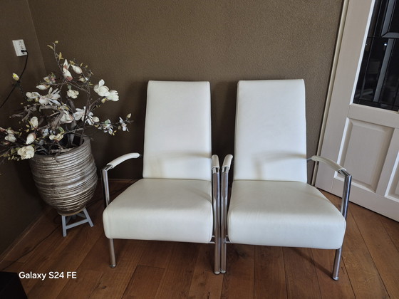 Deze Harvink fauteuils zijn een prachtige toevoeging aan elk modern interieur en zo goed als nieuw. Ze zijn bekleed met wit leer en hebben een strak metalen frame, wat zorgt voor een stijlvolle en eigentijdse uitstraling. De fauteuils bieden uitstekend zitcomfort en zijn ideaal voor zowel ontspanning als formele gelegenheden.
