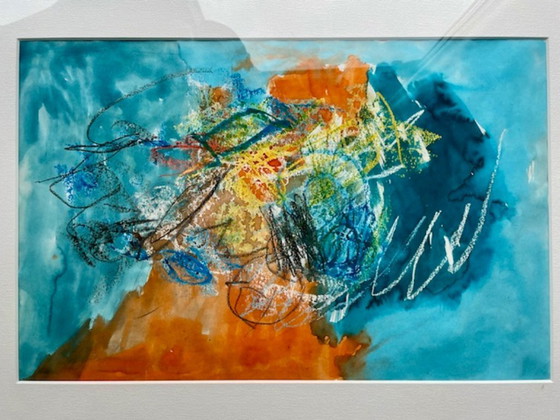 Origineel portret van kunstenares Heidi Feijen, getiteld ‘Ben’. Uitgevoerd in gemengde technieken met guache en verf. Het werk toont een expressief en kleurrijk portret, opgebouwd uit abstracte vormen en dynamische lijnen in oranje, blauw en geel.