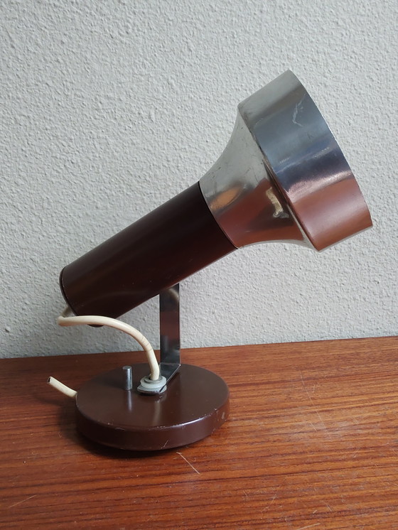 Deze Herda Holland wandspot uit de jaren '60 is een prachtig voorbeeld van Mid Century Modern design. Het heeft een elegante bruine en zilveren afwerking en is gemaakt van duurzaam metaal. Perfect voor het verlichten van specifieke delen van een kamer, deze wandspot voegt een vleugje vintage charme toe aan elk interieur.