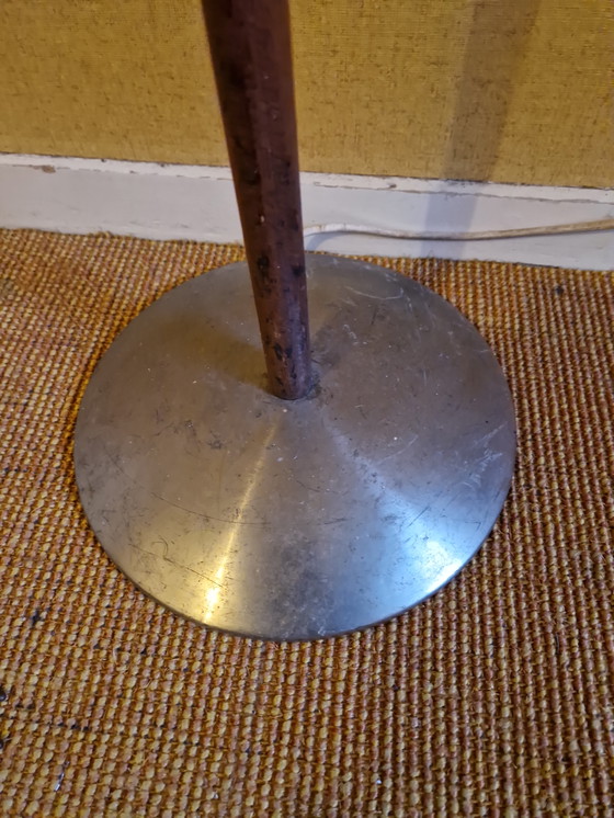 Deze Herda vloerlamp uit de jaren '70 is een echte blikvanger voor je interieur. Met zijn vintage charme en strakke lijnen brengt hij een vleugje retro in elke kamer. De combinatie van hout en metaal geeft de lamp een stoere, industriële uitstraling die perfect past in een modern of klassiek interieur.