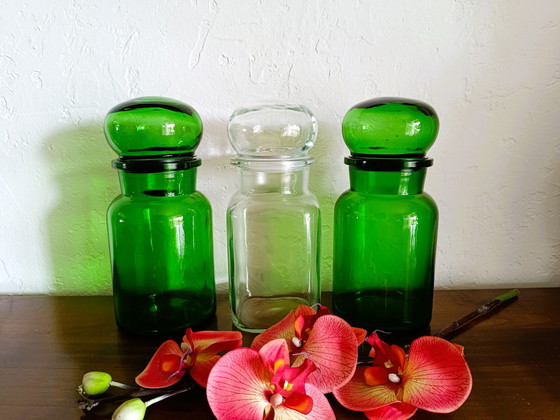Set van 3 glazen apothekersflessen uit de jaren 1970.