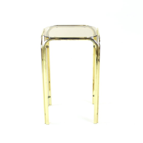 Mooie en elegante bijzettafel geproduceerd in 1970. Hij is hoog en werkt perfect als bijzettafel of als plantenetagère als solitair. De tafel is sterk genoeg voor een grote plant. Hij staat op een metalen constructie met messing afwerking. Het bovenblad is gemaakt van rookglas. Het glas is origineel en is in zeer goede staat zonder chips. De messing afwerking vertoont wat veroudering en gebruikssporen. Toch ziet het item er geweldig uit en zou het een zeer elegante toevoeging zijn aan elk huis.