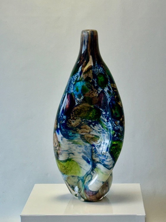 De vaas is mond-geblazen en handgevormd. Door deze spiraalsgewijs te draaien krijgt het een onverwachte vorm en is daardoor unique.