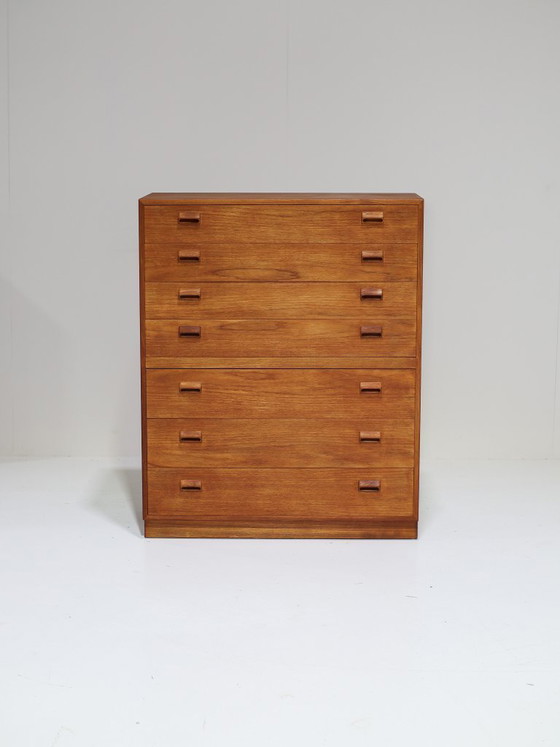 Zeldzame en zeer grote ladekast ontworpen door Børge Mogensen voor Søborg Møbelfabrik, Denemarken 1960s. Deze teakhouten ladekast heeft maar liefst zeven lades, waarvan de onderste 3 extra groot. De massief houten handgrepen hebben een unieke vormgeving; een kenmerkend detail in de stijlvolle en tijdloze designs van Mogensen.