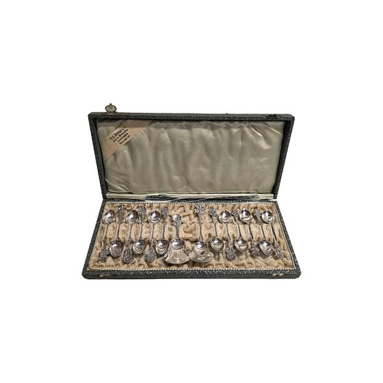 Hollandse zilveren theelepels in cassette, afkomstig uit de 1e helft 20e eeuw. Prachtige set van 12 zilveren theelepels en suikerschepjes met diverse soorten bloemen als versiering. Deze zijn allemaal gemerkt met zwaardje en meesterteken D. de Jong Wz.1899 - 1941 uit Groningen. Verkocht via Fa. S. Bolman & Co. Leeuwarden. De set weegt bij elkaar 142.8 gram.