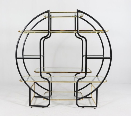 Prachtige ronde etagère of vitrinekast in Maison Jansen-stijl, Milo Baughman, met zeven planken van gehard glas in een frame van messing en zwart gelakt metaal.