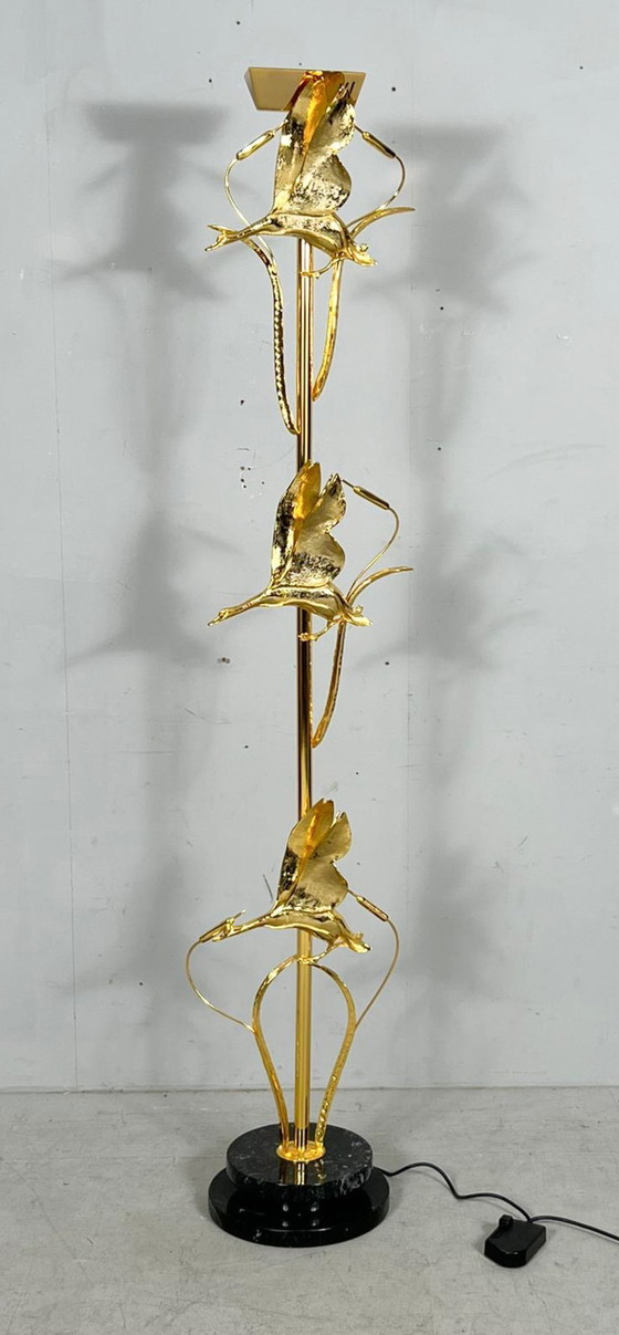 Hollywood Regency staande lamp/vloerlamp met vogelfiguren van Lanciotto Galeotti, L'Originale, Italië, jaren 1980, solide constructie van messing, vuurverguld, op een zwart marmeren voet, één lichtpunt aanwezig, met etiket van de fabrikant,