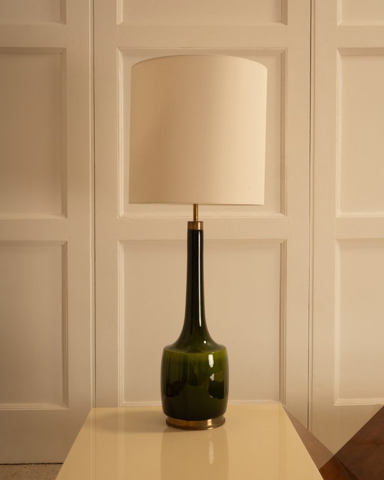 Ontdek de tijdloze elegantie van deze Holm Sorensen lamp uit de jaren 60, een meesterwerk van Deens design. Met zijn diepgroene glazen voet en crèmekleurige kap belichaamt hij de Mid-Century Modern stijl met ongeëvenaarde verfijning.