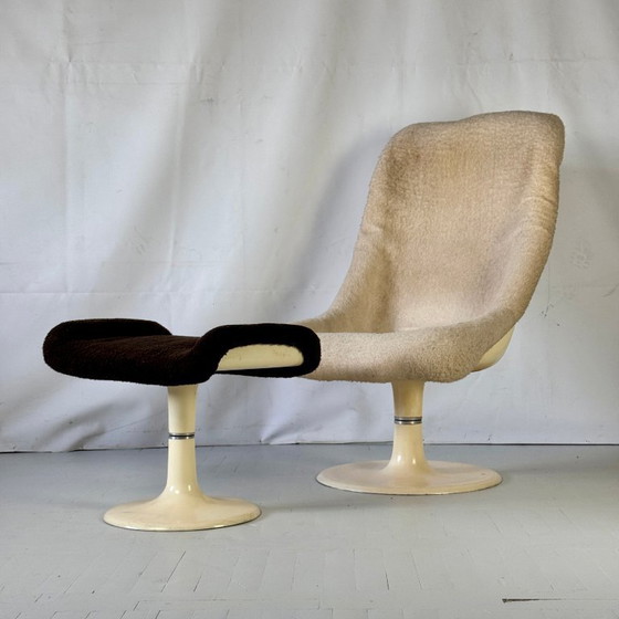 Zeldzame space age draaistoel uit 1960 van Hongaarse makelij met bijpassende voetensteun, beide ontworpen en geproduceerd in Hongarije. Deze set laat de futuristische rondingen en speelse silhouetten zien die kenmerkend zijn voor het tijdperk van de Space Age. Hij is in originele vintage staat en zou kunnen profiteren van een opknapbeurt, die we op maat kunnen bieden.