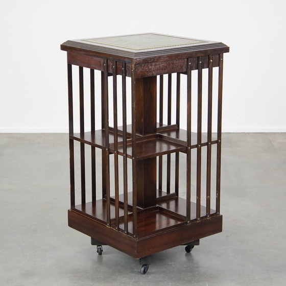 Houten Boekenmolen Met Groen Leren Blad En Op Wieltjes