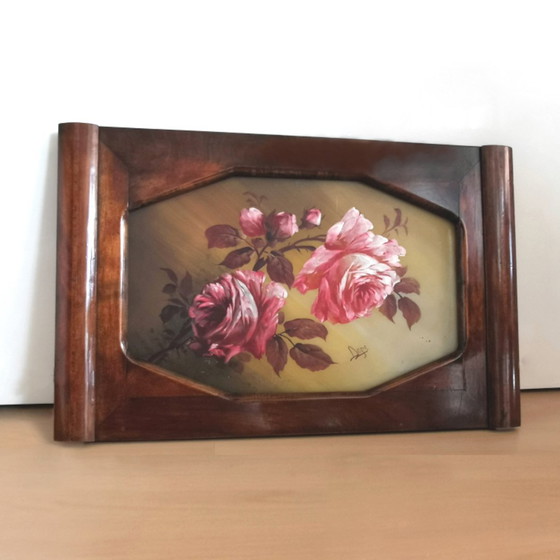 Spectaculair Art Deco dienblad (1920 -1945). Het is gemaakt van massief hout met inlegwerk op de handgrepen en de basis is van glas, het glas is aan de binnenkant met de hand beschilderd om te voorkomen dat de verf zou bederven, het is bekleed met hout en is gesigneerd door de auteur "Pola. Alles handgemaakt en in perfecte staat. Een waar kunstwerk voor verzamelaars.