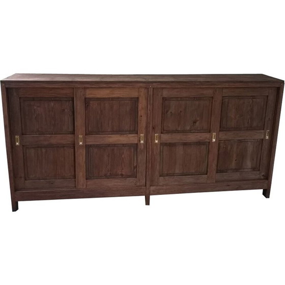 Prachtige patina voor deze oude grenen snoepkast uit de jaren 50, 4 schuifdeuren met messing handgrepen en 6 legplanken