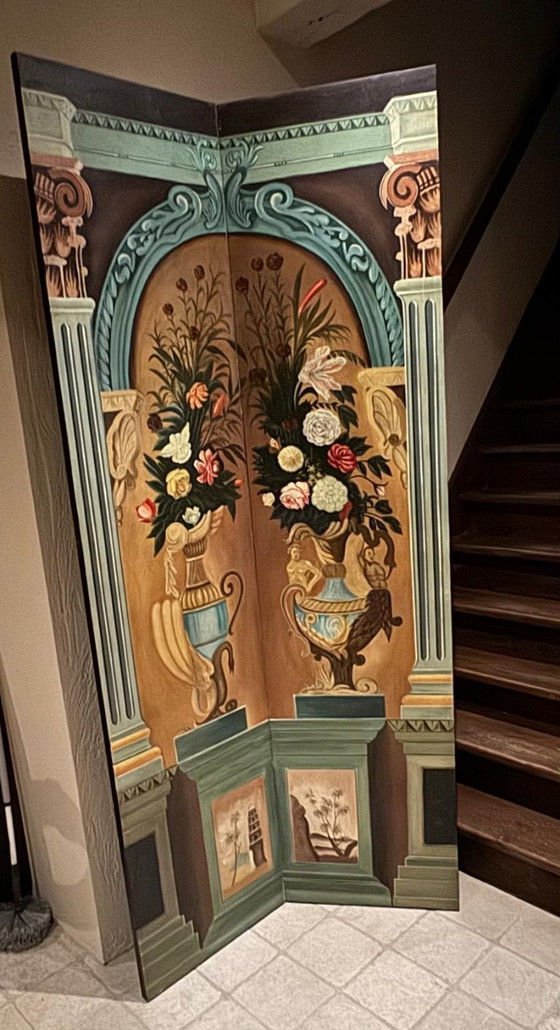 Dit prachtige houten kamerscherm van Maitland-Smith is een echte blikvanger voor je interieur. Met zijn handgeschilderde bloemenmotieven en klassieke details brengt het een vleugje elegantie en kunstzinnigheid in elke ruimte. Perfect om een gezellige hoek te creëren of om een ruimte op een stijlvolle manier te verdelen.