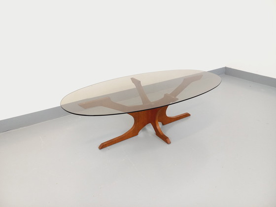Hugues Poignant Vintage Ovale Salontafel in Teak en Rookglas uit de jaren 60 en 70