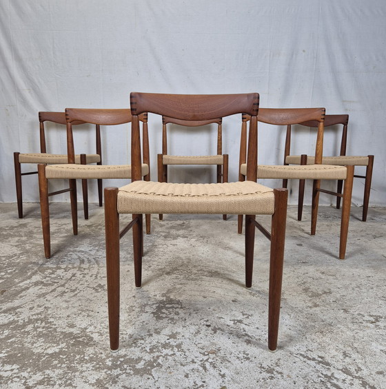 Een originele compleet gerestaureerde set van 6 Deense 🇩🇰 eetkamerstoelen uit de jaren 60. Ontworpen door H.W. Klein voor Bramin, Denemarken.