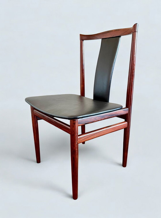 Deze prachtige eetkamerstoelen jaren 60 van de Deense ontwerper Henning Sørensen zijn een absolute must-have voor designliefhebbers van Scandinavisch modern, mid-century. Deze stoelen combineren elegantie en functionaliteit, met een prachtige afwerking in palisanderhout, een duurzame en exclusieve houtsoort die bekend staat om zijn rijke kleuren en unieke nerf. Opnieuw bekleed in zwarte skai. Fotos maken deel uit van de beschrijving.