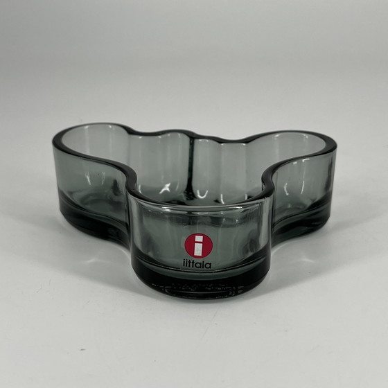 Originele Iittala theelichthouder uit de iconische Alvar Aalto collectie, uitgevoerd in elegant rookgrijs glas.