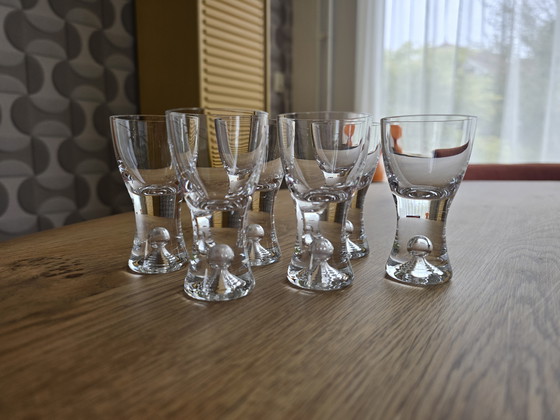 Deze set van zes mondgeblazen glazen behoort tot de iconische Tapio-serie, in 1952 ontworpen door de Finse meesterontwerper Tapio Wirkkala voor Iittala. Met een hoogte van 8 cm zijn deze glazen specifiek bedoeld als borrel- of likeurglazen, gekenmerkt door de massieve voet waarin een enkele, perfecte luchtbel is gevangen—een ambachtelijk hoogstandje dat met de hand wordt gevormd met een nat houten stokje in het hete glas. Alle 6 nog in uistekende staat!