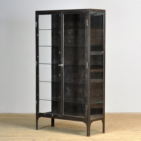 Medische kast uit de jaren 1930. De kast is gemaakt in Hongarije en is gemaakt van dik ijzer en glas. Het slot en de handgreep zijn origineel en functioneel. De kast is gestript tot op het metaal en afgewerkt met een transparante lak. Wordt geleverd met 5 glazen legplanken.
