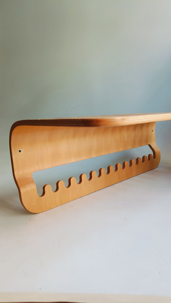 Deze Ikea Kantra kapstok is gemaakt van berkenmultiplex met een ontwerp geïnspireerd door Alvar Aalto. De Scandinavische stijl is duidelijk zichtbaar in de strakke lijnen en functionele vorm. De kapstok heeft meerdere sleuven voor het ophangen van spullen, waardoor hij zowel praktisch als stijlvol is. Ideaal voor moderne interieurs, het combineert nut met esthetische aantrekkingskracht. Gebruikssporen op de bovenkant.