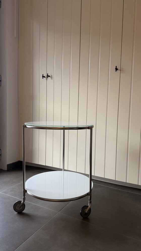 Beleef de elegantie van de jaren 80 opnieuw met deze prachtige IKEA STRIND tafel, ontworpen door de befaamde Ehlén Johansson. Dit vintage meubelstuk combineert naadloos tijdloos design met praktische functionaliteit, perfect voor wie waarde hecht aan zowel vorm als nut in zijn interieur. De tafel heeft een strak glazen blad in combinatie met een stevig metalen frame, waarmee de minimalistische esthetiek van die tijd perfect tot uiting komt. Het ontwerp met twee niveaus biedt voldoende ruimte voor decoratie of opbergruimte, waardoor het een veelzijdige aanwinst is voor elke kamer. Dankzij de soepel rollende wielen is de tafel gemakkelijk te verplaatsen. Verrijk uw woonruimte met dit iconische meubelstuk dat vintage charme prachtig combineert met moderne functionaliteit. Informeer vandaag nog en maak hem van u.