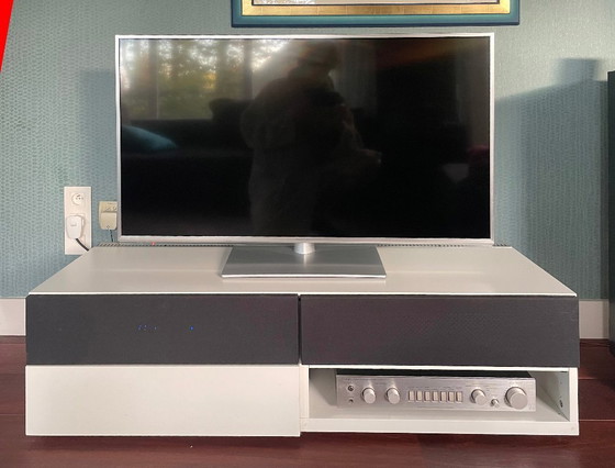 Elegant vintage Ikea TV/stereomeubel met schuif, in zeer goede staat. Je kunt er een versterker en wifi-router in opbergen en de afstandsbediening werkt door het zwarte doek. De toestellen kunnen werken terwijl terwijl je ze niet ziet. Hun kablage kan volledig weggewerkt worden.