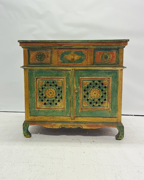 Deze vintage/antieke kast komt waarschijnlijk uit India. De kast is handbeschilderd in groen en oranje en voorzien van houtsnijwerk. Hij vertoont lichte gebruikssporen die passen bij de leeftijd. Dit meubelstuk is een mooie aanvulling voor iedereen die op zoek is naar een unieke kast met een eigen karakter.