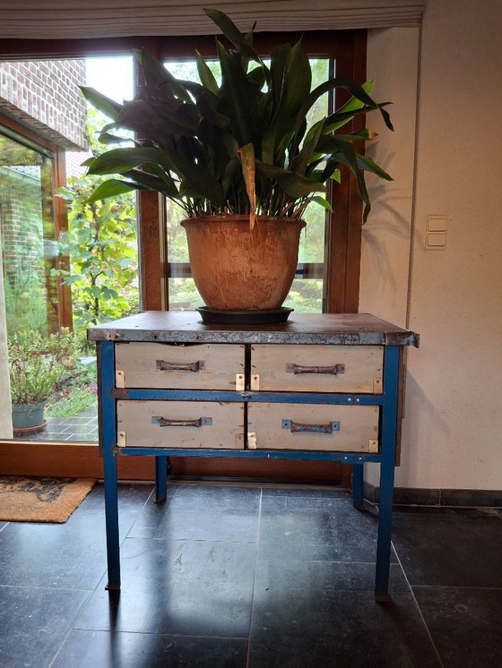 Stevige (en zware) metalen werktafel met vier lades en een zwaar doorleefd blad. Mooi opgemaakt met behoud van karakter. Prachtig verweerde patina: ideaal als eyecatcher in een interieur, maar ook bruikbaar als werktafel of kast in atelier/werkplaats.