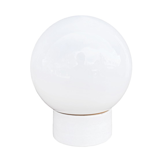 Plafondlamp of wandlamp type OWS100 vervaardigd in Polen (PRL) in de jaren 1960. Lamp gemaakt van wit glas met een bolvorm. Inschroefbare lampenkap gemonteerd op een keramische voet. Functionele lamp voor een enkele E27 lamp tot 60W. Originele staat, zeer goed, vertoont lichte gebruikssporen. Lichte beschadiging aan de voet.