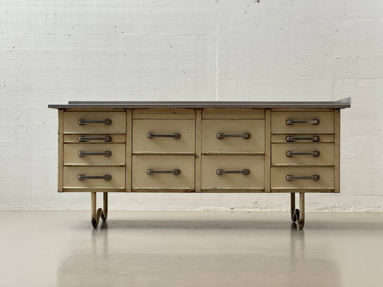 Een royaal industrieel meubelstuk, volledig vervaardigd uit plaatstaal, met een strak, functioneel ontwerp en een uitgesproken technische uitstraling. De langwerpige romp rust op gebogen stalen buispoten en wordt bekroond door een zwaar roestvrijstalen werkblad met een spatbescherming aan de achterzijde. De voorkant is symmetrisch verdeeld en voorzien van diverse ondiepe laden van verschillende breedtes, elk uitgerust met karakteristieke metalen handgrepen. De laden schuiven soepel en bieden voldoende opbergruimte, waarschijnlijk oorspronkelijk bedoeld voor een werkplaats, laboratorium of keuken. De originele crèmekleurige lak, met zichtbare tekenen van ouderdom, benadrukt het authentieke industriële karakter en maakt dit meubelstuk tot een opvallend statementstuk, geschikt als dressoir, keukeneiland of studiomeubel. Het aanzienlijke gewicht van circa 400 kg getuigt van de uitzonderlijk robuuste constructie en industriële kwaliteit van dit meubelstuk.
