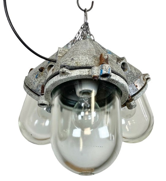 Industriële kroonluchter gemaakt van drie Elektrosvit gegoten aluminium lampen met explosiebestendig glas, vervaardigd in het voormalige Tsjecho-Slowakije in de jaren 70. De kroonluchter weegt 15 kg.