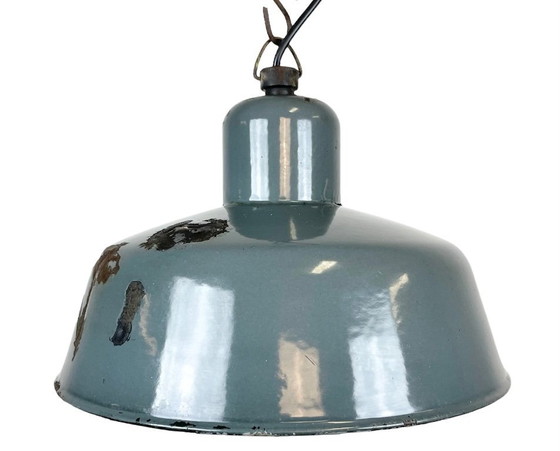 Industriële hanglamp van grijs emaille, gemaakt door Siemens in Duitsland in de jaren 50. Witte emaille aan de binnenkant van de kap. IJzeren bovenkant. De porseleinen fitting is geschikt voor E27-lampen. Nieuwe bedrading. Volledig functioneel. Het gewicht van de lamp is 1 kg. Helaas is het Siemens-opschrift niet volledig bewaard gebleven.