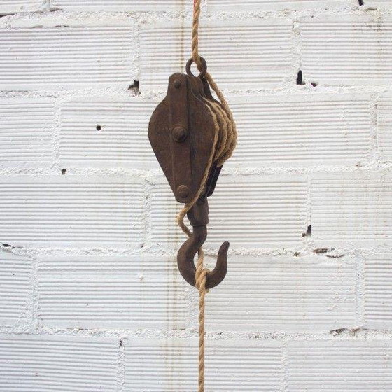 Lamp in industriële stijl gemaakt van een vroeg 20e-eeuwse katrol. De bedrading is een touw in rustieke stijl met een keramische lamphouder.