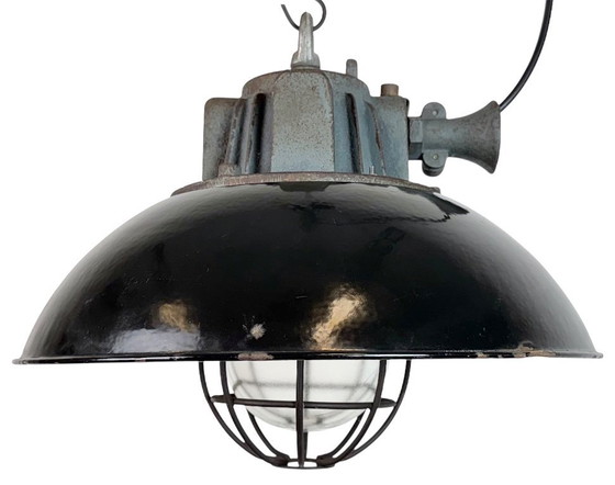 Industriële hanglamp, geproduceerd door Elektrosvit in het voormalige Tsjecho-Slowakije in de jaren 60. De lamp heeft een zwarte geëmailleerde kap met een witte geëmailleerde binnenkant, een gietijzeren bovenkant, een helder glazen afdekplaat en een ijzeren rooster. De porseleinen fitting is geschikt voor standaard E27/E26-lampen. Nieuwe bedrading. De lamp weegt 11 kg.