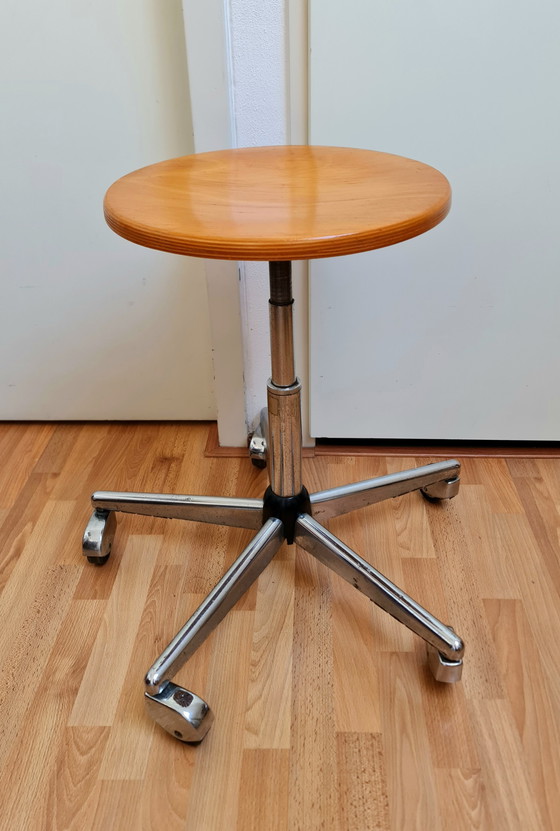 Een unieke industriële vintage draaikruk van metaal met een prachtige beukenhouten zitting. Deze unieke oude architectenkruk, tekenkruk of werkkruk is uit de jaren '70 en kan naar beneden en naar boven gedraaid worden. De kruk is vanzelfsprekend gebruikt, echter werkt goed. Een bijzondere eyecatcher en gespreksonderwerp van oersterke kwaliteit die elk interieur mooier maakt. De zithoogte is op de laagste stand 44 cm en op de hoogste stand 60 cm.