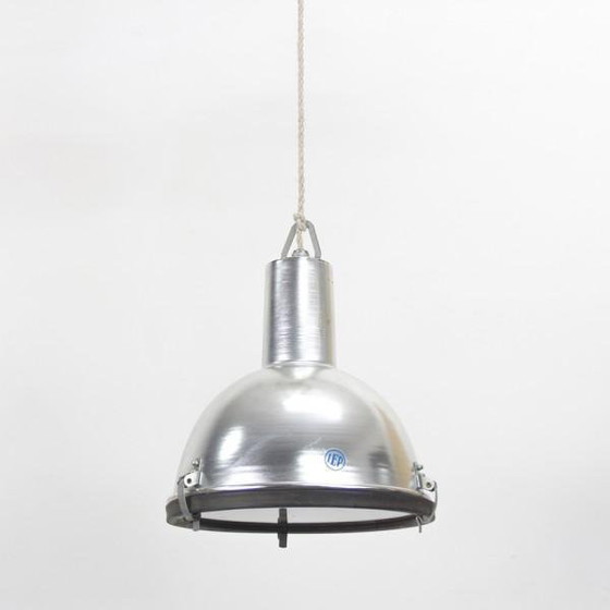 Industriële plafondlamp I.E.P. Merk. Gepolijst aluminium met glazen diffuser.